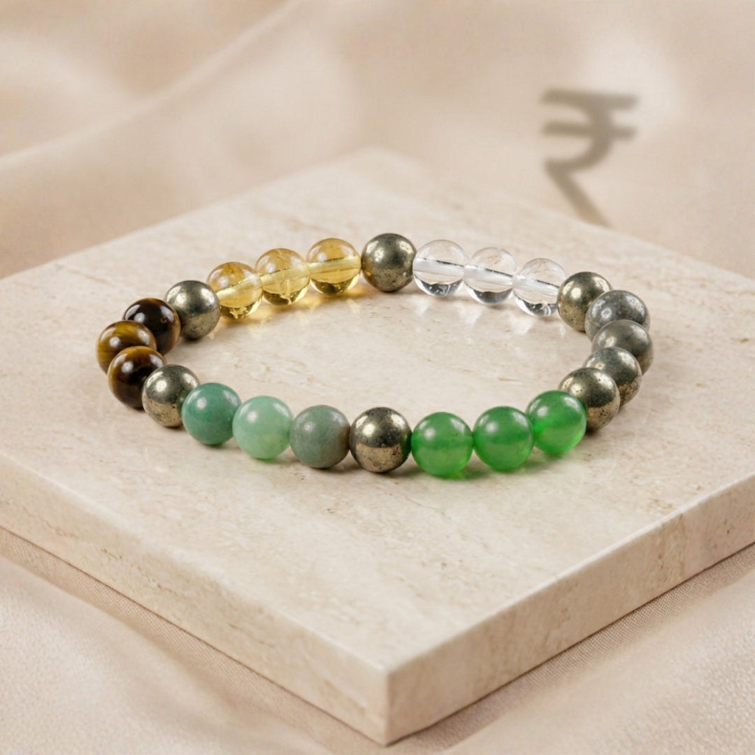 Crystal bracelets containing stones like Citrine, Pyrite, Tiger’s Eye, and Green Aventurine are traditionally associated with prosperity, confidence, and opportunity. These crystals are often chosen by entrepreneurs and professionals seeking abundance-focused symbolism.