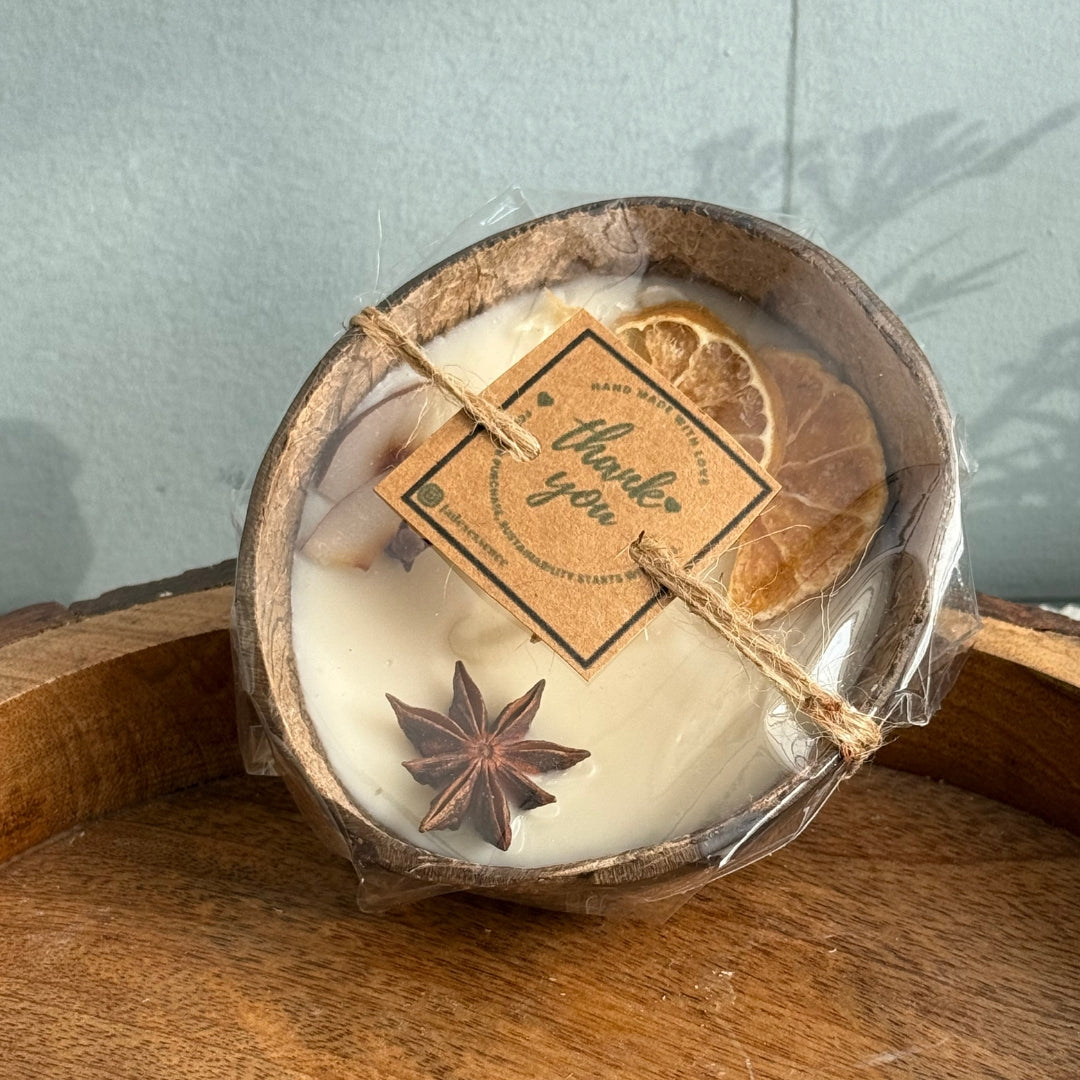Add a rustic and traditional charm to your space with the Coconut Shell Candle with Dry Spices. Hand-poured in a natural coconut shell, this unique candle is crafted using eco-friendly soy wax, a handmade jute fiber wick, and infused with IFRA certified Sandalwood fragrance. Designed to burn clean and long, it’s an eco-conscious choice for home décor, meditation, and gifting.