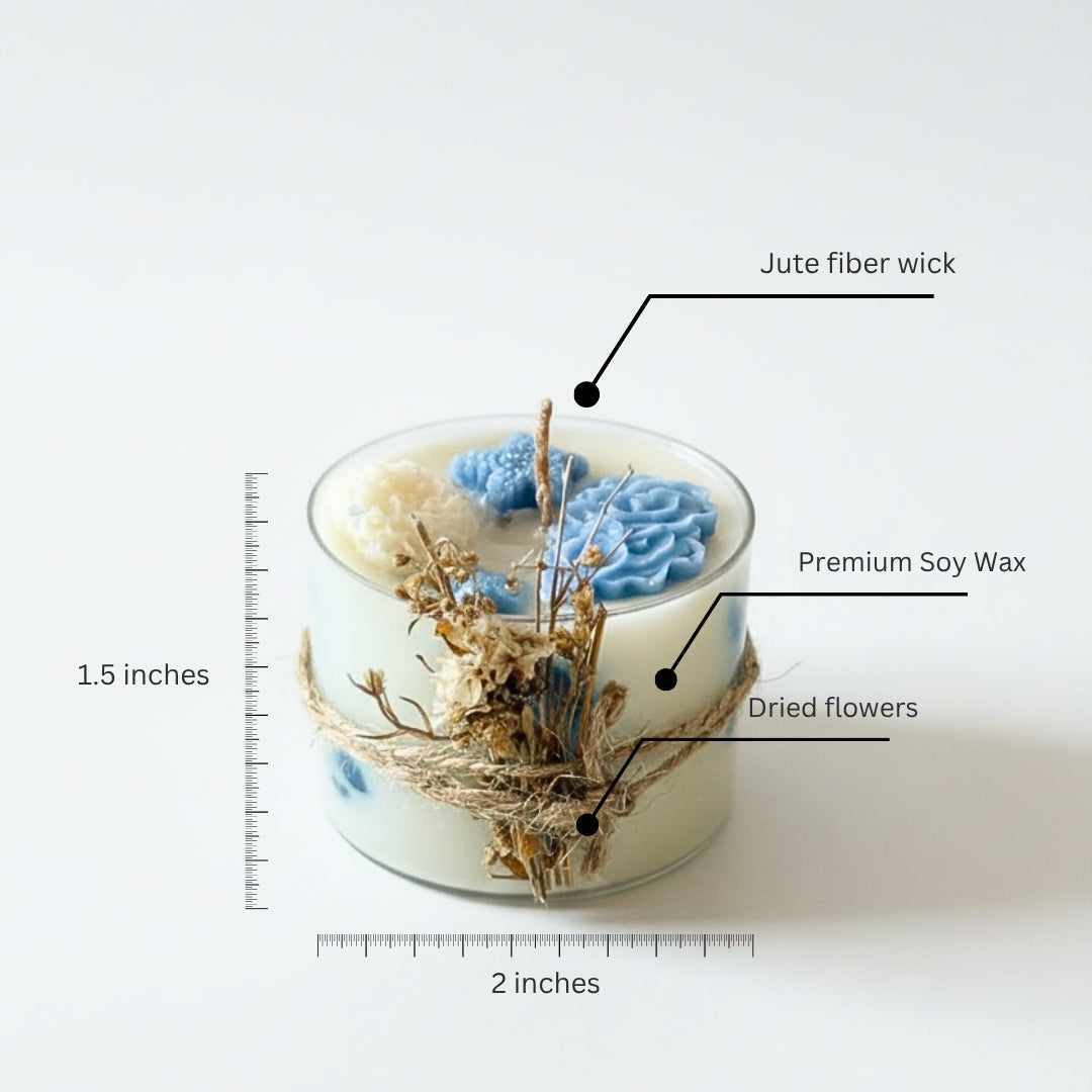A premium eco friendly candle crafted with 100% soy wax and a handmade jute fiber wick. Compact yet powerful, this 60gm candle offers a 25-hour clean burn, making it perfect for gifting or creating a cozy ambience.