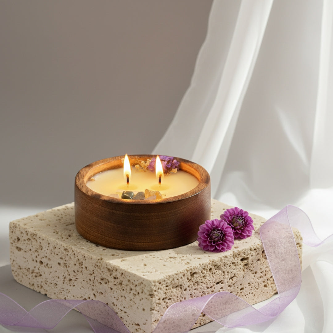 A soothing eco luxe candle crafted with soy wax, handmade jute fiber wick, and natural White Sage crystals. Designed in a reusable wooden round jar for a rustic, premium touch.